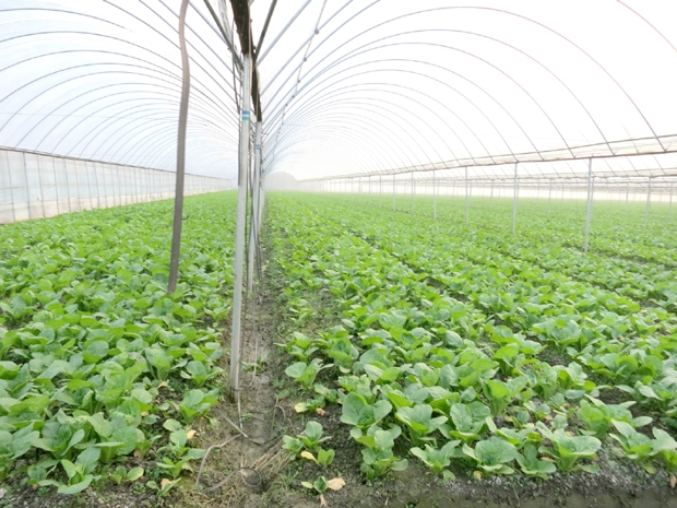 图为大棚里引进种植的饭包白菜。