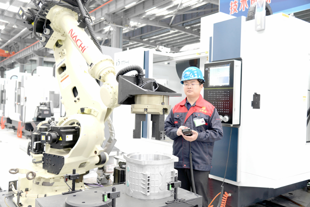 江苏众志达新能源汽车部件有限公司生产车间内,技术人员正在操作智能机器人。陈玉柱 摄