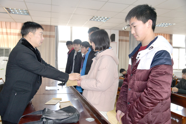 图为王生芝向13名贫困学生每人发放1000元人民币。陈玉柱摄