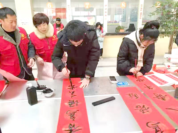 图为二实小学生现场书写新春对联、福字等,赠送给回乡旅客。孙环宏 马智波摄