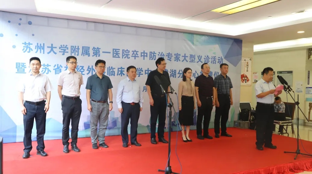 9月18日上午,苏大附一院脑卒中防治专家大型义诊暨省神经外科临床医学中心建湖分中心揭牌仪式在县人民医院南院区门诊隆重举行,省医学会神经外科分会候任主任委员、苏大附一院神经外科主任王中教授,省医师协会神经外科分会副会长、苏大附一院神经外科行政副主任虞正权教授,苏大附一院神经外科祁震宇教授、黄煜伦教授、李吻教授、吴江教授、刘建刚教授及县人民政府副县长周戍、县人民医院党政领导班子成员、职能部门中层干部及医护人员代表等参加揭牌仪式,仪式由县卫健委党委副书记、副主任王锋主持。