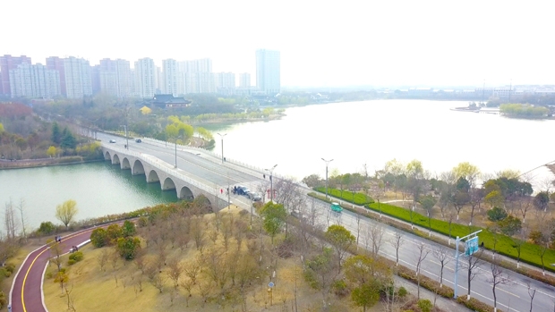 双湖公园九孔曲桥兼具衔接东西湖廊道和秀夫路交通节点功能。为缓解桥头跳车现象,此次桥面改造在保持全桥外侧曲线线型不变的基础上,将桥面拱顶处下降约25公分,并在两侧低洼处填补沥青料,使桥面上的行车曲线坡度放缓,提高行车舒适度,增加安全系数。