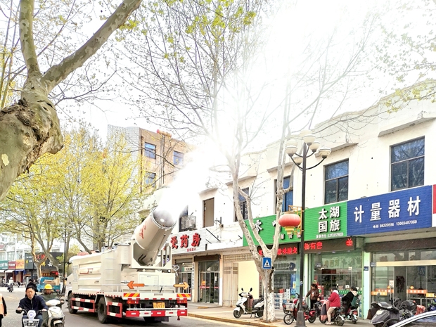 近年来,我县以国家新型城镇化示范县建设为引领,高标准加强城市管理,加大资金投入,购置城市美容保洁新装备,既为道路除尘保湿,又利于行道绿化清洁卫生,全力推进文明城市创建。图为日前雾炮机正在人民路进行城市绿化病虫害防治工作。唐才生 陈玉柱 摄