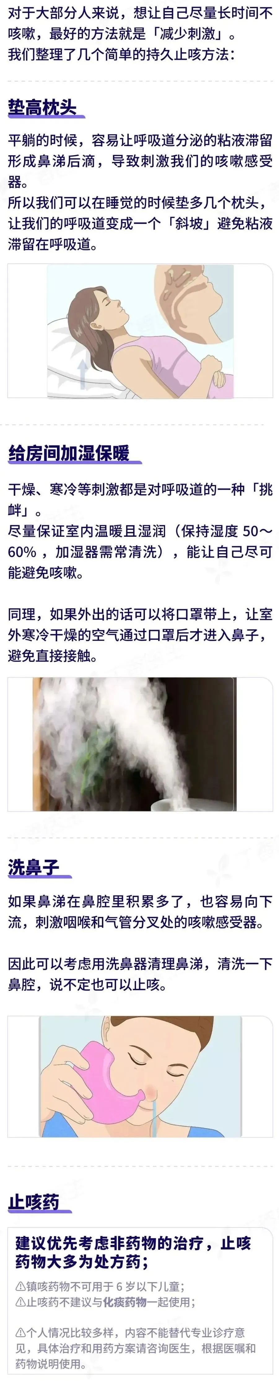 总的来说: ❈ 咳嗽如果不影响正常生活和睡眠,可以先缓缓; ❈ 如果想止咳,先别急着吃药,可以先试试给空气加湿,减少刺激,或者喝点蜂蜜梨水等方法,让自己舒服一点; ❈ 如果咳嗽后出现呼吸困难等症状,一定要尽快前往医院。