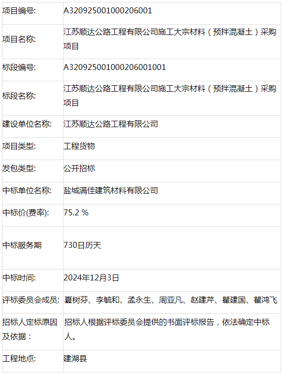 江苏顺达公路工程有限公司施工大宗材料(预拌混凝土)采购项目