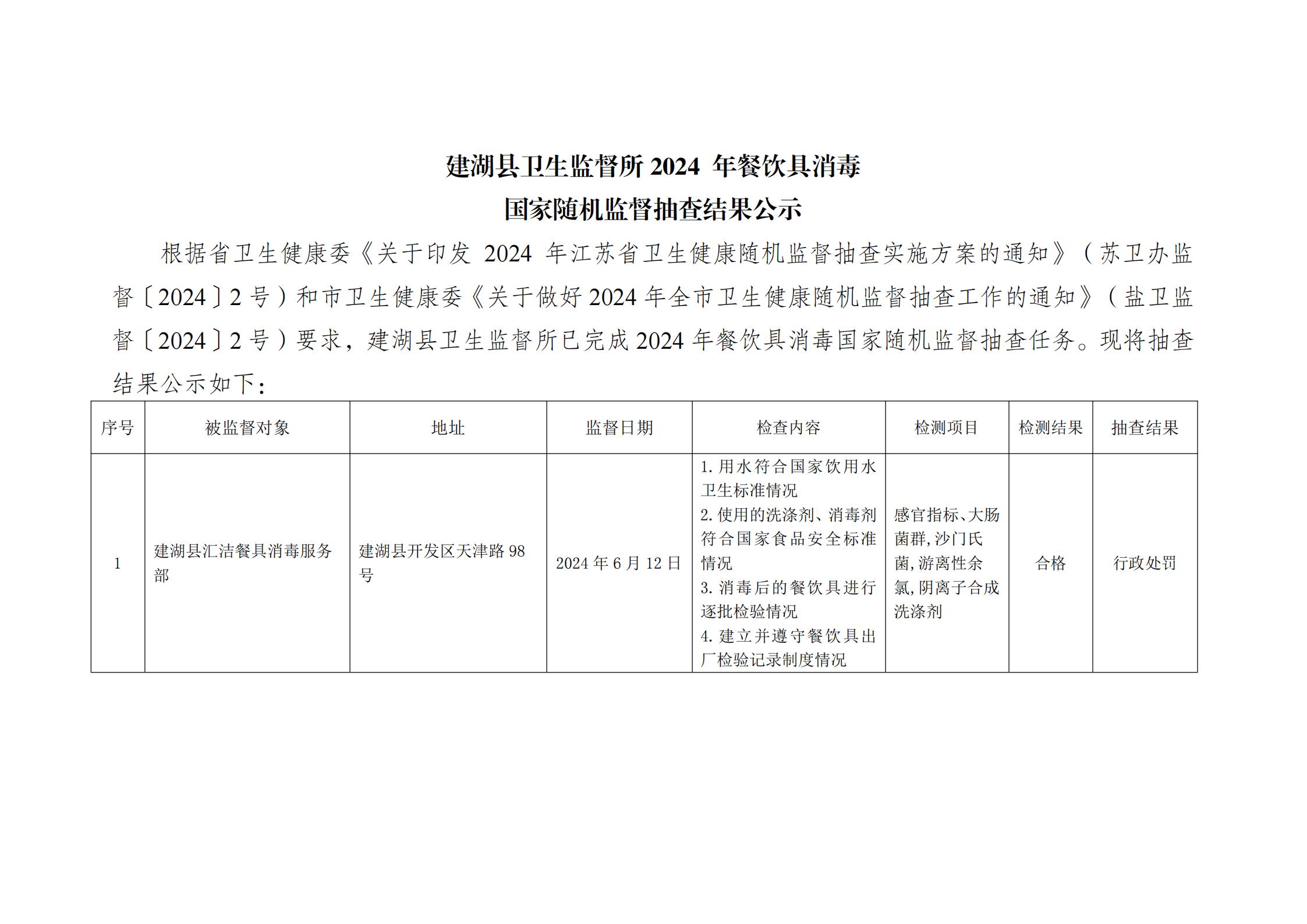 建湖县卫生监督所2024 年餐饮具消毒国家随机监督抽查结果公示