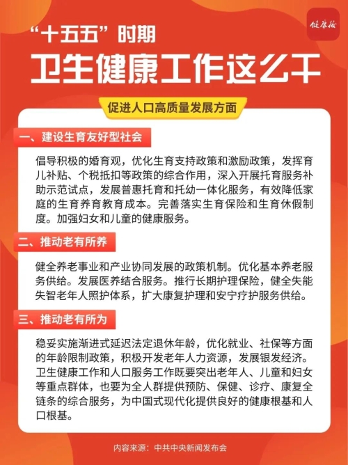 近期,中共中央举行新闻发布会,介绍和解读党的二十届四中全会精神。国家卫生健康委党组书记、主任雷海潮在会上详解了“十五五”时期卫生健康工作要点,快来看看都有哪些吧!