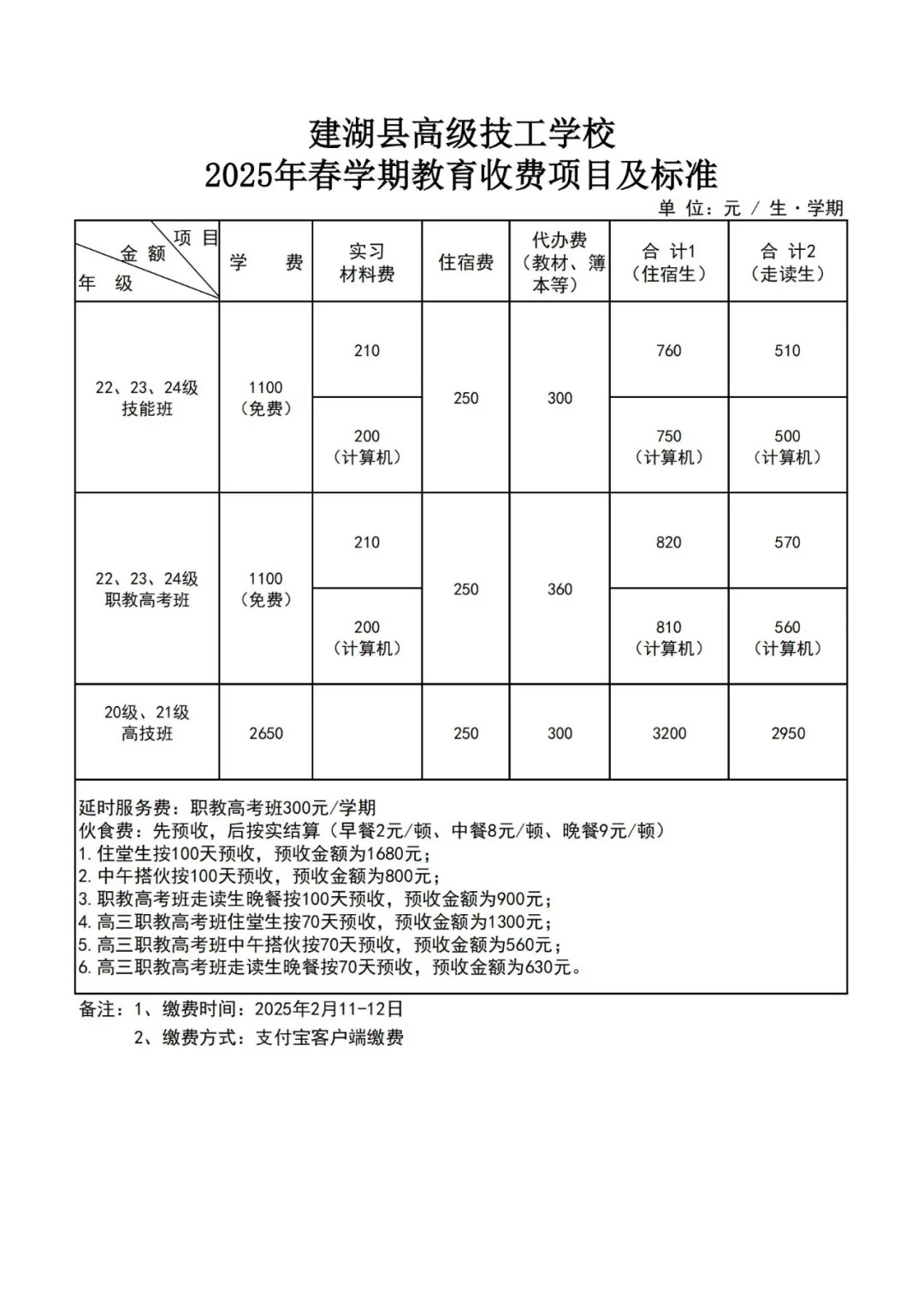建湖高级技工学校2025年春学期教育收费项目及标准