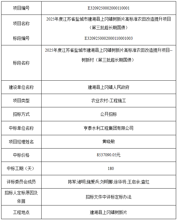 2025年度江苏省盐城市建湖县上冈镇树新片高标准农田改造提升项目--树新村(第三批超长期国债)中标结果公告